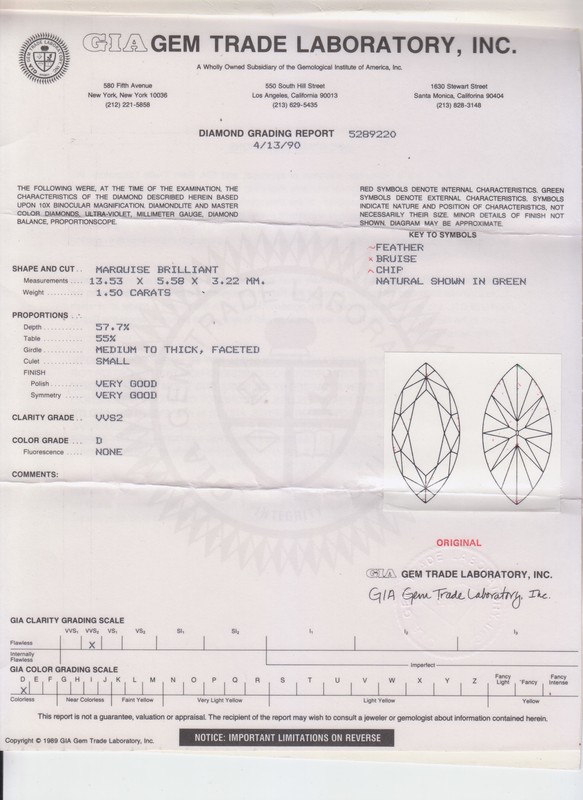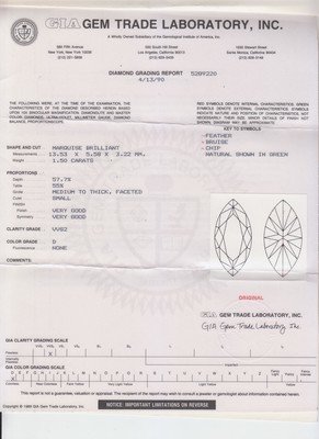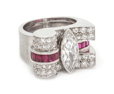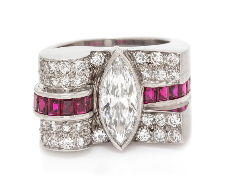 containing one marquise cut diamond weighing 1.50 carats, 42 round brilliant cut diamonds weighing approximately 1.75 carats total and 14 rectangular step cut rubies weighing approximately 1.00 carat total.Stamp: 10085 PLAT (maker's mark) PT950.Accompanied by a Gemological Institute of America diamond grading certificate number 5289220, dated April 13, 1990, stating Color: D, Clarity: VVS2, Polish: Very good, Symmetry: Very good, Fluorescence: None.