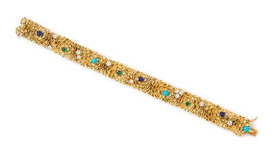 designed as a flexible mesh link with overlapping flower petals interspersed with 11 round brilliant cut diamonds weighing approximately 1.21 carats total, three round cabochon cut sapphires measuring 4.10-4.50 mm in diameter, three round cabochon cut emeralds measuring 3.00-3.75 mm in diameter, and three round cabochon cut turquoise measuring 4.25-4.65 mm in diameter, measuring approximately 14.00 mm wide.Engraved: Cartier. Stamp: 750 30649.