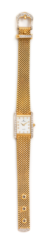 the bezel containing 24 round brilliant cut diamonds weighing approximately 0.48 carat total, 19.00 x 27.00 mm case dimensions inclusive of lugs, mother-of-pearl dial signed CYMA, round single cut diamond numerals, gold pitched dauphine hands, case back affixed by four screws, quartz movement, woven mesh link bracelet, buckle motif clasp containing 52 round brilliant cut diamonds weighing approximately 0.26 carat total.Case back stamp: (Swiss hallmark) 18K 750.Accompanied by a warranty card dated 2008, booklets, inner and outer box signed CYMA.
