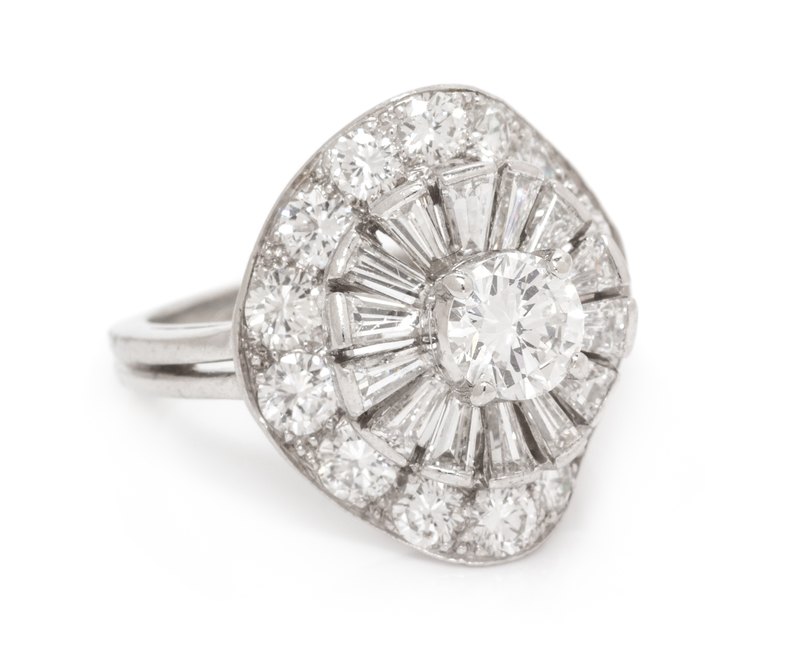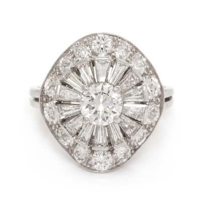 containing one round brilliant cut diamond weighing approximately 0.57 carat, 14 tapered baguette cut diamonds weighing approximately 1.12 carats total and 14 round brilliant cut diamonds weighing approximately 1.40 carats total.Stamp: 60689 IRID PLAT.