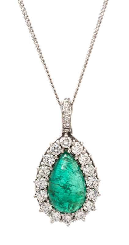 consisting of a pendant containing one pear shape cabochon cut emerald measuring approximately 16.35 x 9.80 x 6.52 mm and 21 round brilliant cut diamonds weighing approximately 1.33 carats total, suspended from a 14 karat white gold curb link chain.Chain stamp: 585 v88.