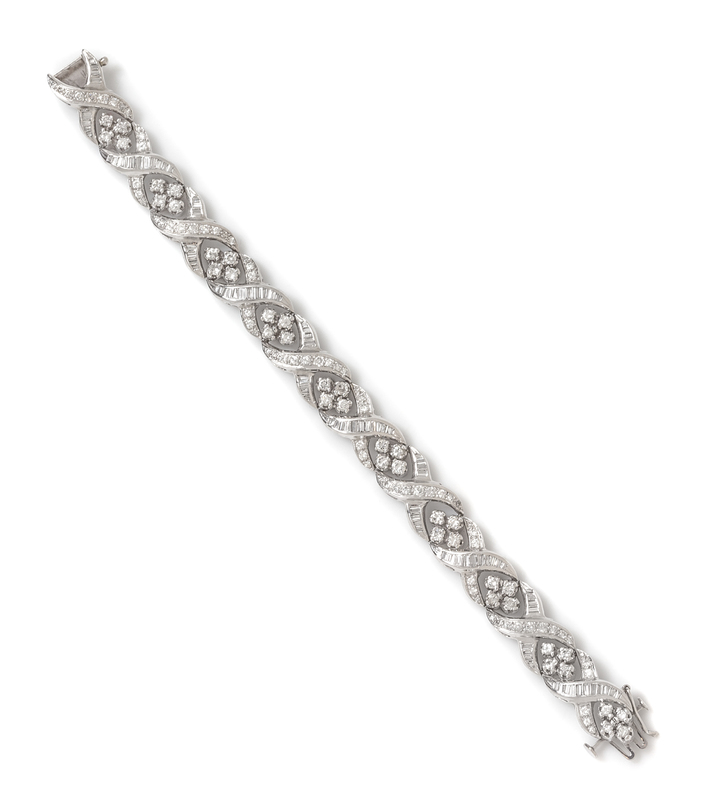 consisting of alternating platinum X shaped links and navette shaped cluster links, containing 115 single and round brilliant cut diamonds weighing approximately 2.25 carats total and 95 baguette cut diamonds weighing approximately 1.25 carats total.
