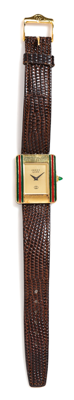 1980s,with a goldtone rectangular face with the signature green and red enamel stripes, swiss movement, a decorative green crown and a brown leather textured band.Stamped: Gucci.