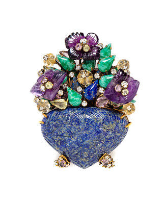 goldtone with a lapis lazuli vase, carved amethyst flowers and topaz buds and rhinestones.Stamped: Iradj Moini.