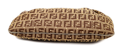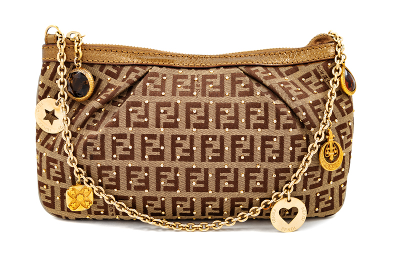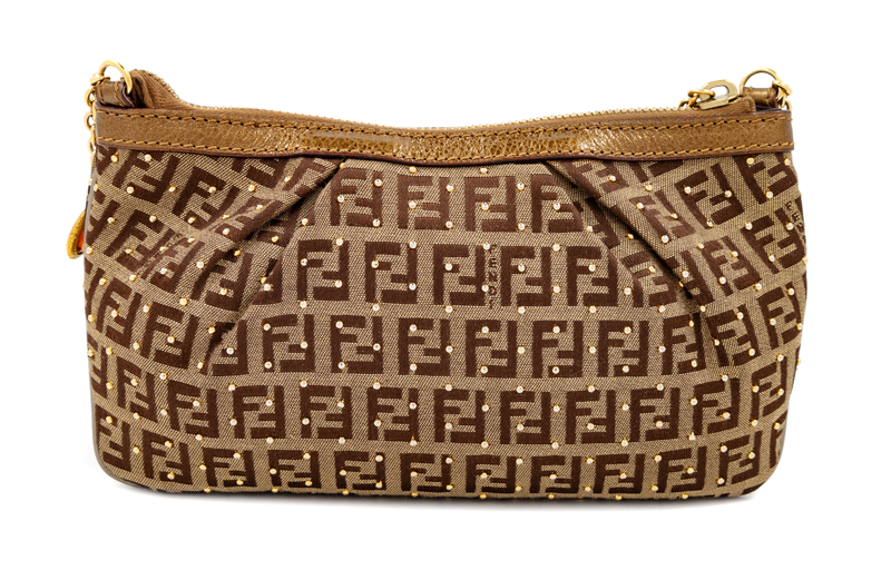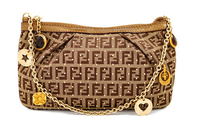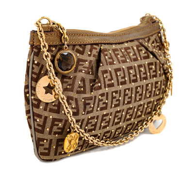 with goldtone hardware, Zucca canvas, a top zip closure and a decorative chain link strap featuring dangling charms. Stamped: Fendi.