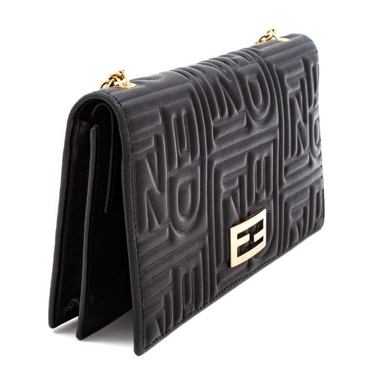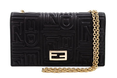 with goldtone hardware, a removable chain shoulder strap, a front flap with a snap button closure an interior white/multicolor graphic lining with seven card slots, two flat pockets, one slip pocket and a coin pocket. Together with a dust bag. Stamped: Fendi.