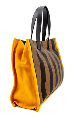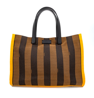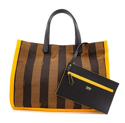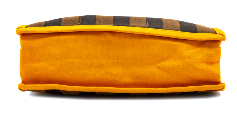 with yellow canvas trim, dual flat leather handles, a top magnetic snap closure and an interior removable flat leather zip pouch.Stamped: Fendi.