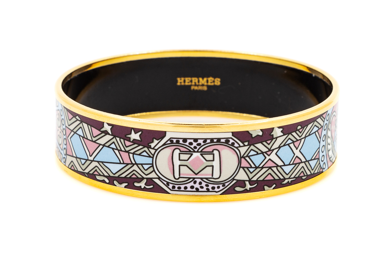 with gold plated rims and a multicolor feather and geometric motif. Made in Austria. Together with a pouch.Stamped: Herms.
