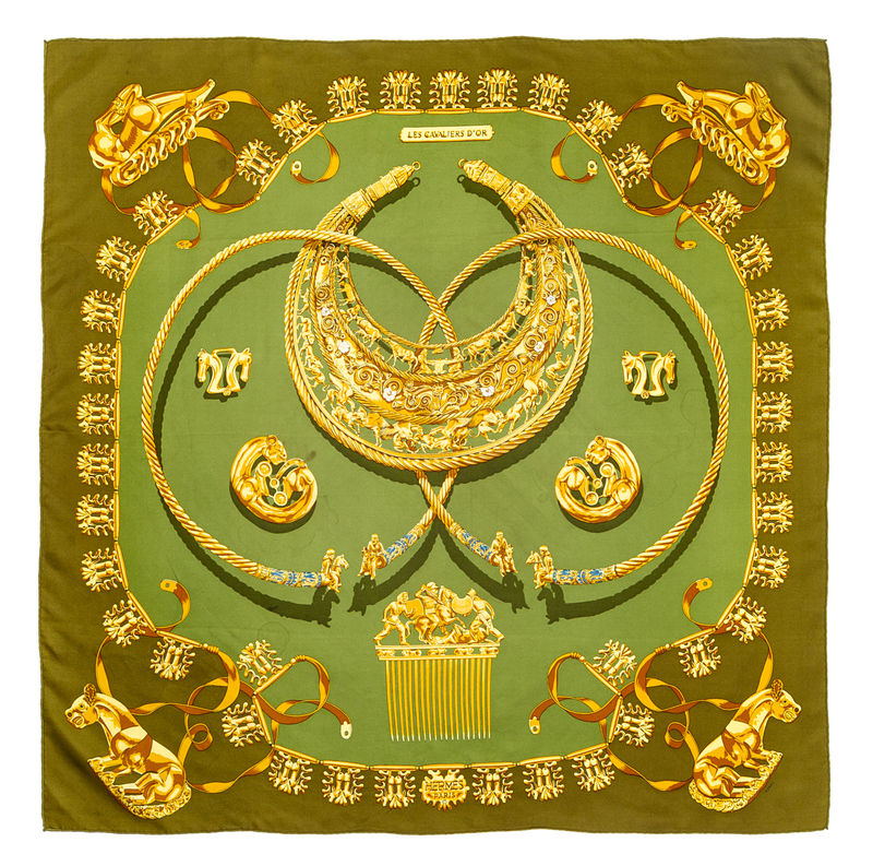 "Les Cavaliers d'Or" pattern, designed by Vladimir Rybaltchenko. Labeled within the print: Herms.