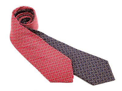 the first red with a geometric motif; the second navy with a classic bit motif. Together with a box.Labeled: Herms.
