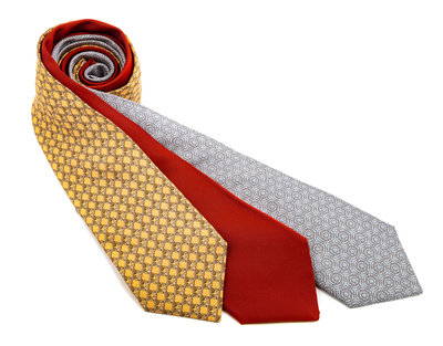 the first yellow with a link motif; the second a red iridescent diagonal ribbed silk; the third grey with a hexagon and H link motif.Labeled: Herms.