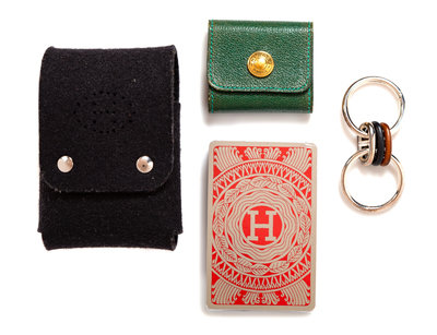 including a deck of playing cards, together with a dark brown felt cover with snap closure, a dust bag and a box; a sterling silver double key ring, together with a dustbag and box; a miniature green leather notebook.Stamped: Hermes.
