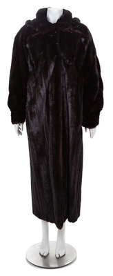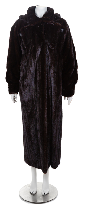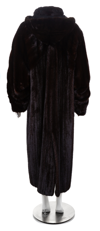 collared with decorative faux walnut button embellishment at the front panels, hook and eye front closure, four front slip pockets, a back center split hem, a detachable hood and fully lined in logo brown silk.Labeled: Fendi.