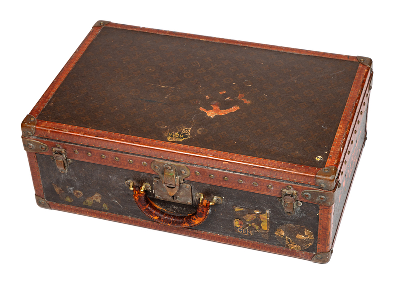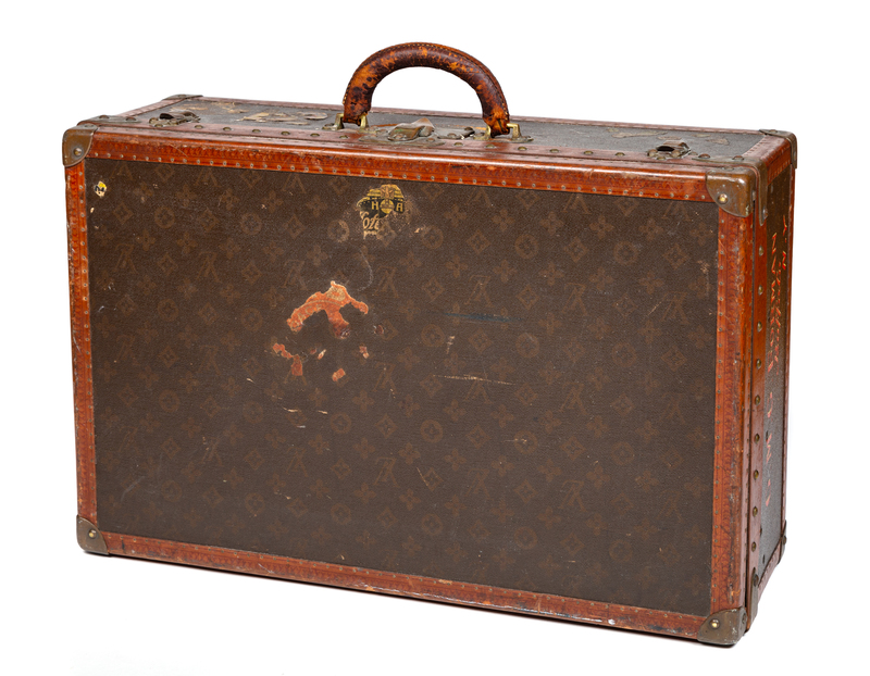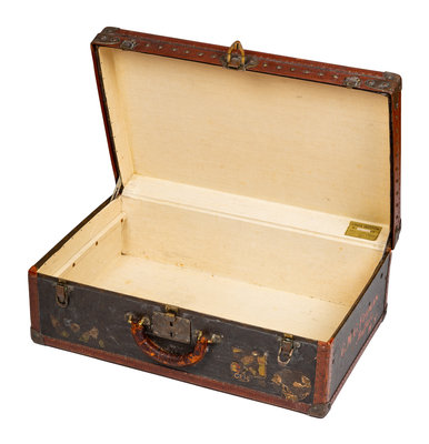 with brass hardware, logo LV embossed leather trim, a single top leather handle with two trunk latches and an S-lock closure. Stamped: Louis Vuitton.