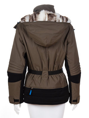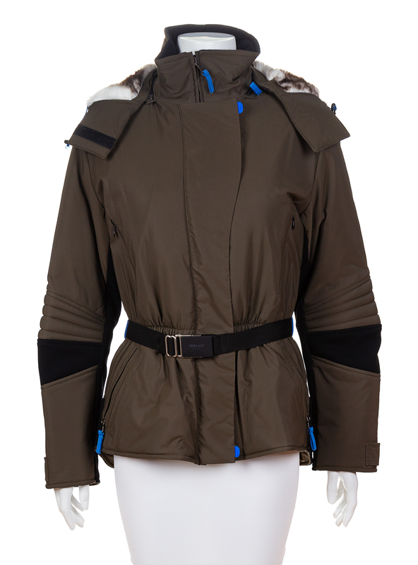 with four front zip pockets, decorative black trim, a cinched waist with a black belt with a silver buckle, a front zip and velcro closure, a removable hood with faux fur lining and thermal insulation.Labeled: Versace Sport.