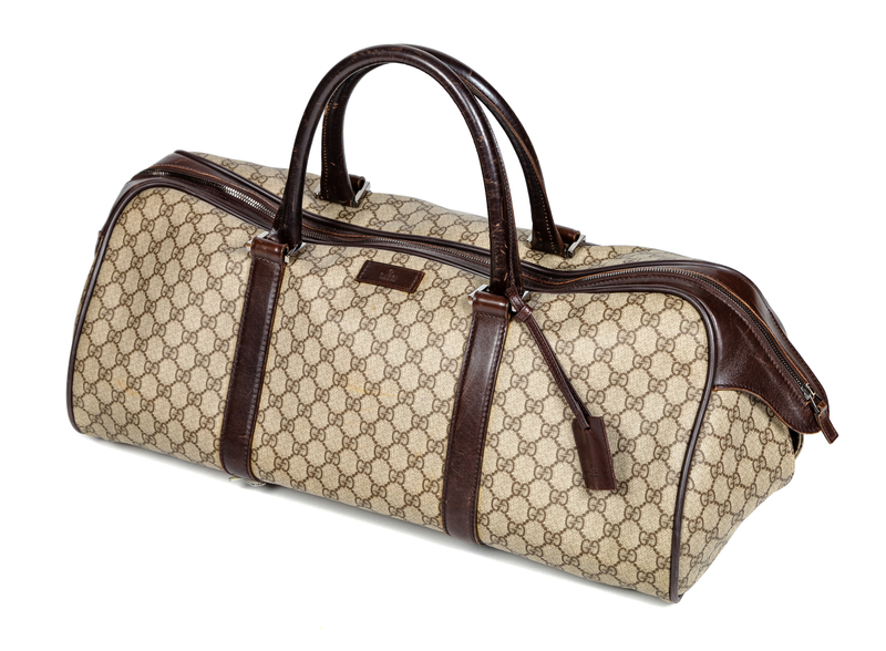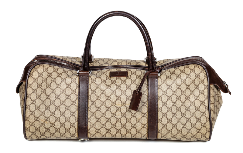 with dark brown leather trim, dual rolled handles, a top zip closure, a removable luggage tag and an interior zip pocket.Stamped: Gucci.