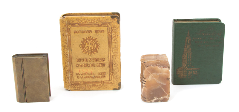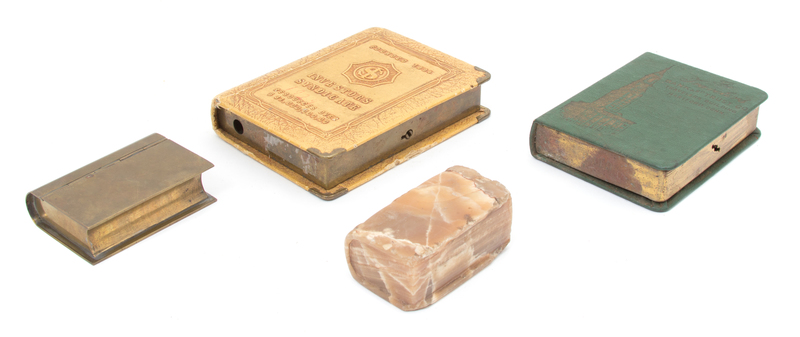 comprising two banks, a brass hinged top box and a carved marble paperweight.