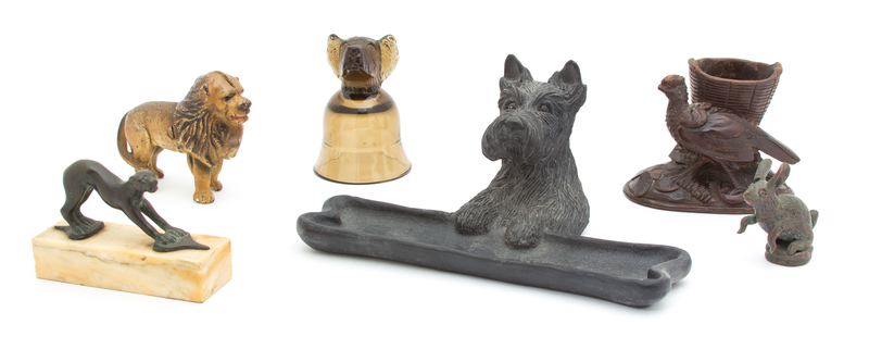 comprising a glass stirrup cup with dogs head, a polychromed iron lion bank, a bronze rabbit, a carved wood sculpture of pheasant with basket, a French bronze sculpture of a panther on a marble base and a bone shaped pen tray with a Scottie.