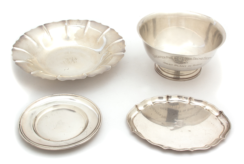 comprising an engraved Revere style bowl, a monogrammed foliate form bowl, a monogrammed oval card tray and a side plate