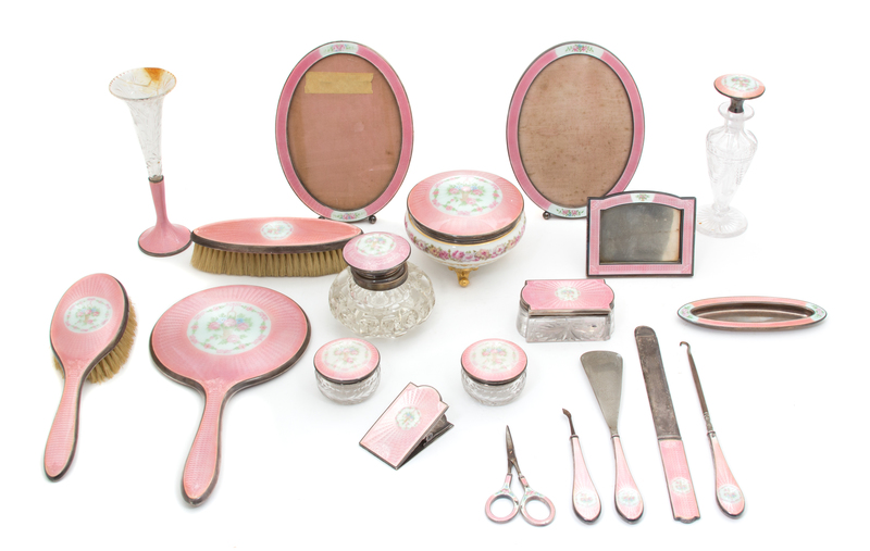 comprising three frames, a mirror, a clothes brush, a hair brush, a perfume bottle with stopper, a brush pot, a pill holder, a clip, a bud vase, an inkwell, a diminutive tray, five desk articles; 20 items total.
