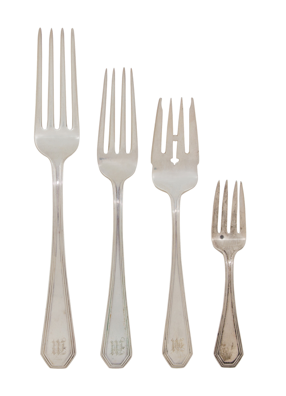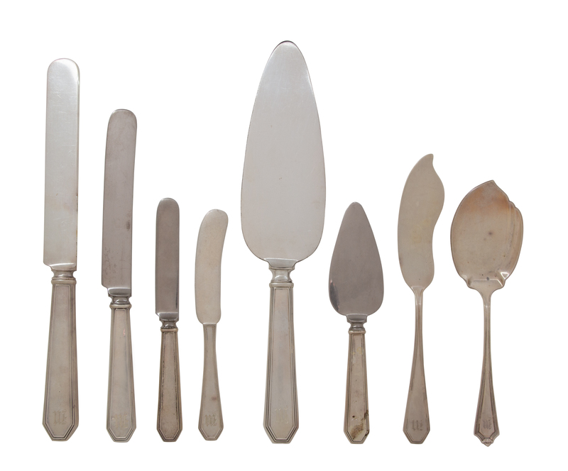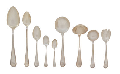 comprising:12 dinner knives12 luncheon knives12 dinner forks12 luncheon forks12 dessert forks12 teaspoons12 soup spoons12 cream soup spoons12 butter spreaders12 ice cream spoons12 coffee spoons8 iced tea spoons6 demitasse spoons6 table spoons1 jelly spoon1 butter knife1 cream ladle1 ice cream server1 cheese server1 demitasse fork1 pie server,together with box159 pieces total
