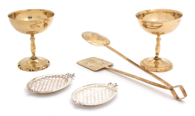 comprising a pair of gilt wash champagnes, a pair of gilt wash tongs and a pair of pineapple-form ashtrays