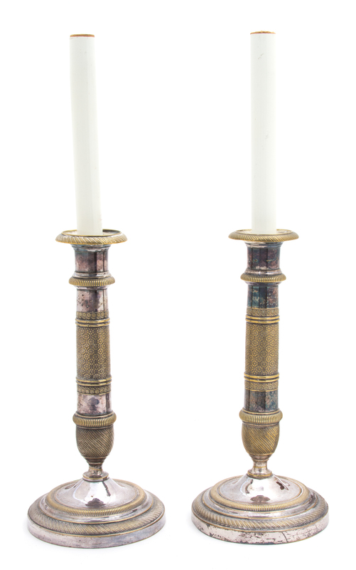 A Pair of Empire Style Silver Plate Candlesticks