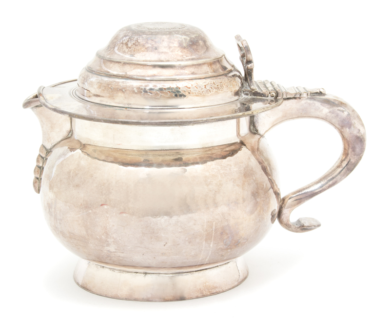 the lid inset with an Irish coin, with an engraved armorial on the body.
