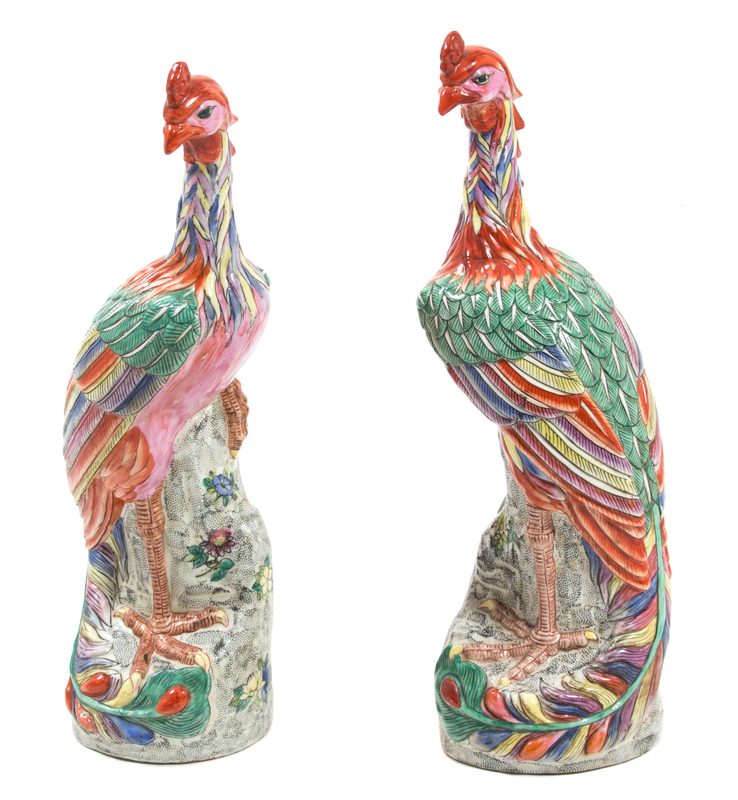 A Pair of Chinese Painted Porcelain Models of Phoenix Birds
