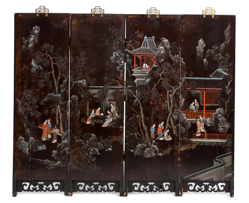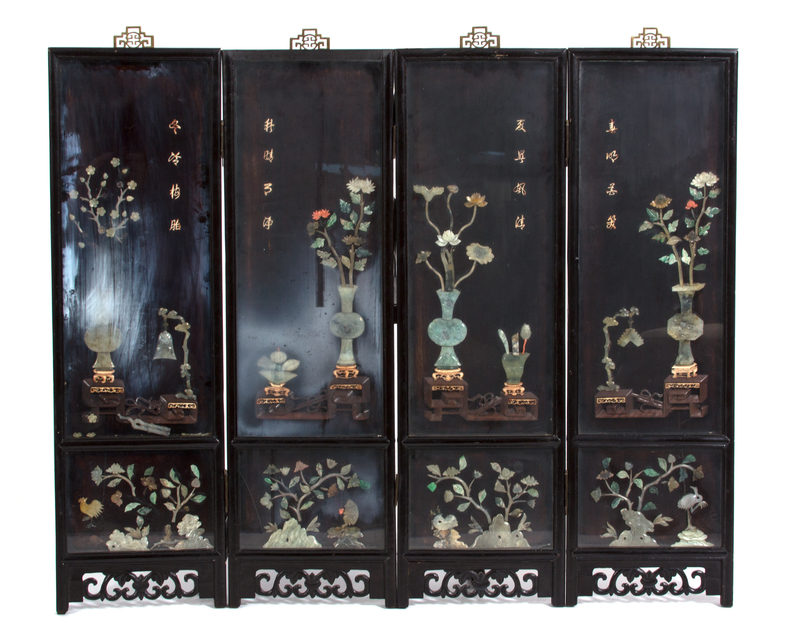 A Set of Four Chinese Hardstone Embellished Hardwood Panels