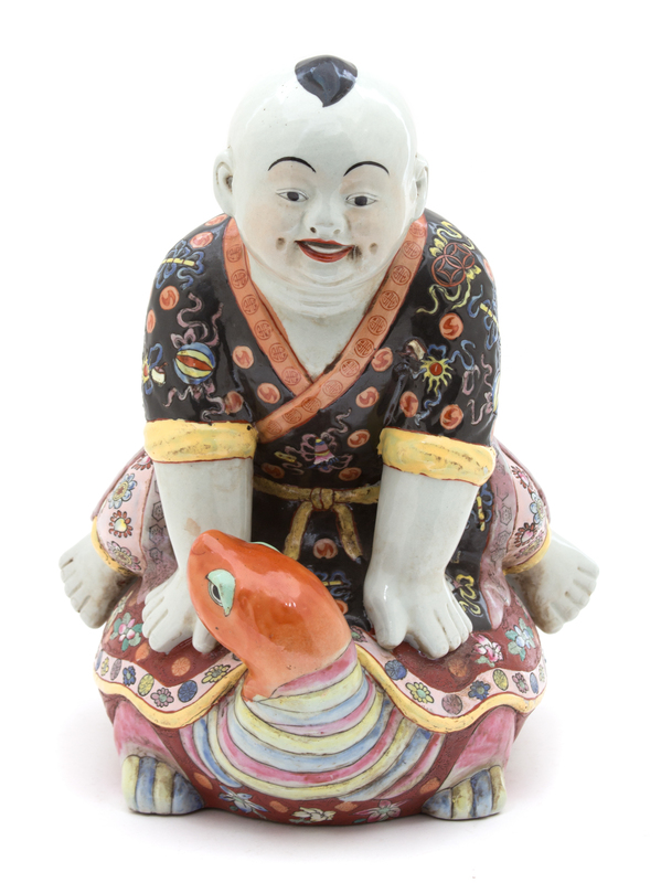 A Chinese Polychromed Porcelain Figure of a Boy Riding a Turtle