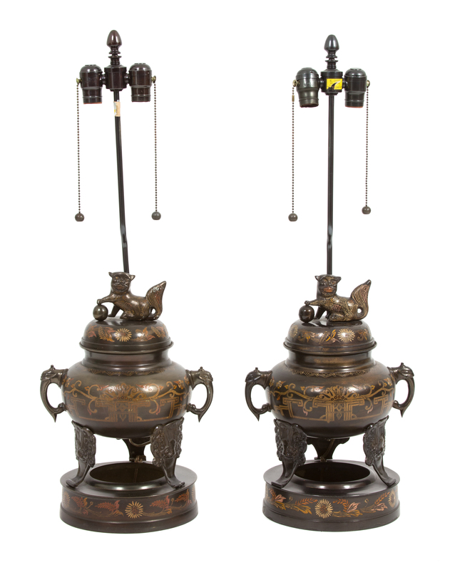 A Pair of Asian Bronze Censers with Foo Dog Finials