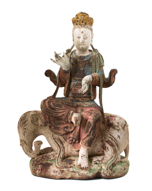 A Southeast Asian Polychromed Carved Wood Figure of Bodhisattva Astride an Elephant