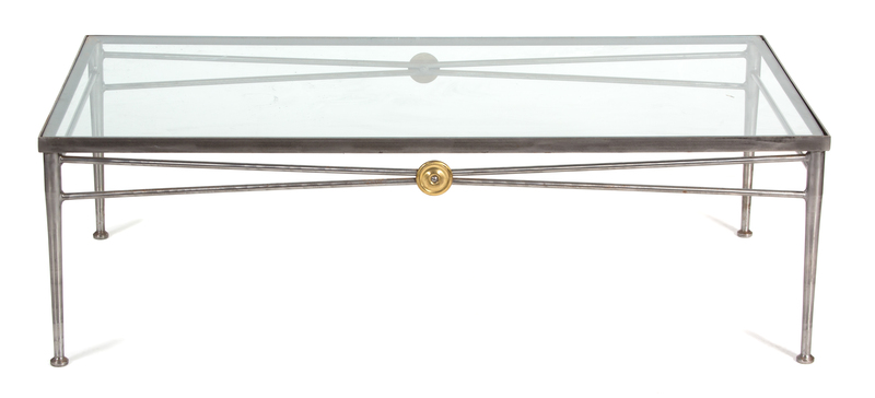 A Neoclassical Style Brushed Steel Glass Top Coffee Table