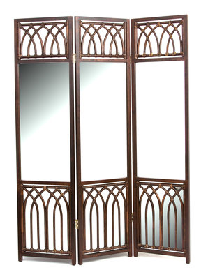 A Three Panel Mahogany, Rattan and Mirrored Floor Screen