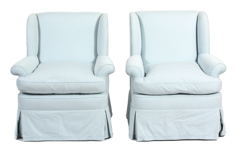 A Pair of Blue and White Checked Upholstered Wing Chairs