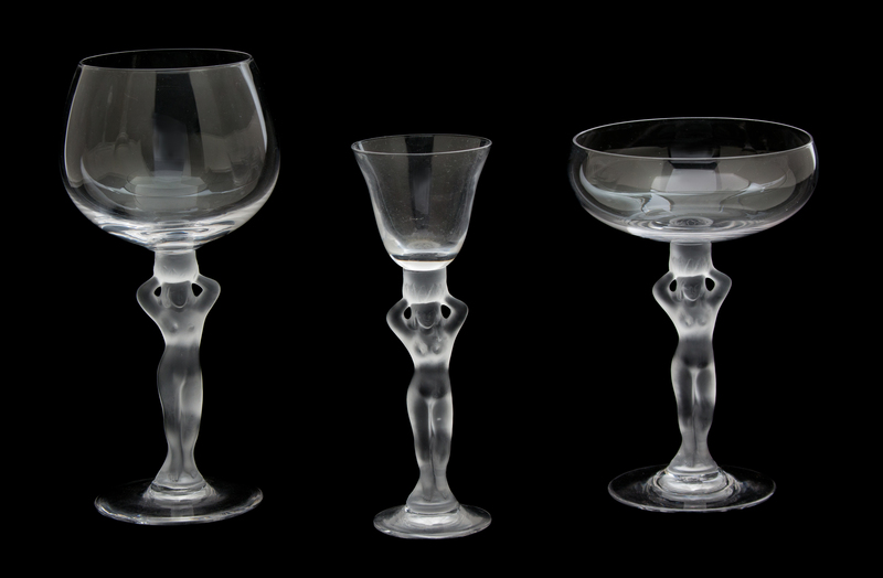 A Set of Eighteen Lalique Style Molded and Frosted Stemed Glasses