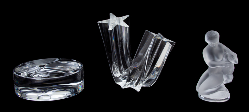 comprising a Bacarrat bowl, a Lalique frosted glass maiden with fawn, and a Steuben Star Stream.