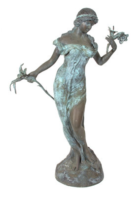 A Large Art Nouveau Style Bronze Fountain Depicting a Female with Flowers in Hand
