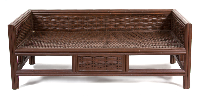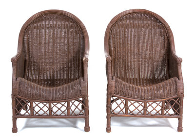 A Suite of Contemporary Brown Wicker and Stained Wood Outdoor Furniture