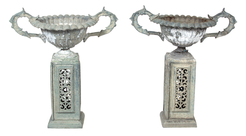 A Pair of Patinated Metal Garden Urns on Pierced Bases