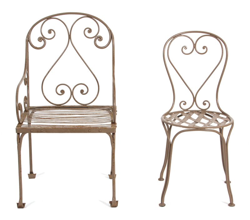 comprising a round table with fiberglass top, four armchairs and six side chairs; painted taupe.