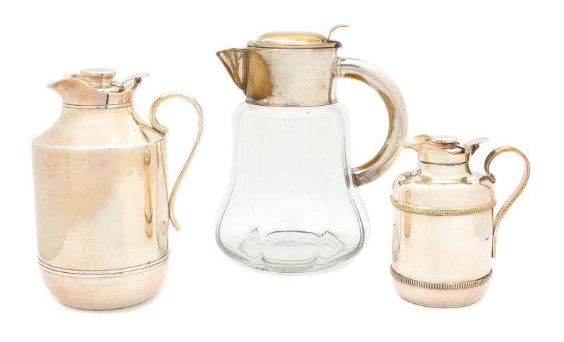 comprising two Italian silver plate thermos pitchers and a silvered brass collared molded glass ewer.