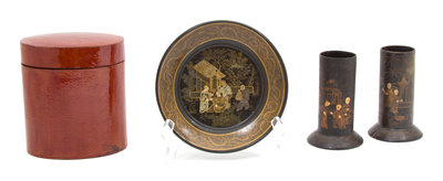 comprising two chinoiserie decorated black lacquer spill vases, a similar plate, and a red lacquer oval nest of three boxes.