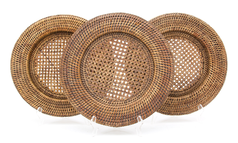 A Rattan Rectangular Serving Tray and Eleven Plate Holders