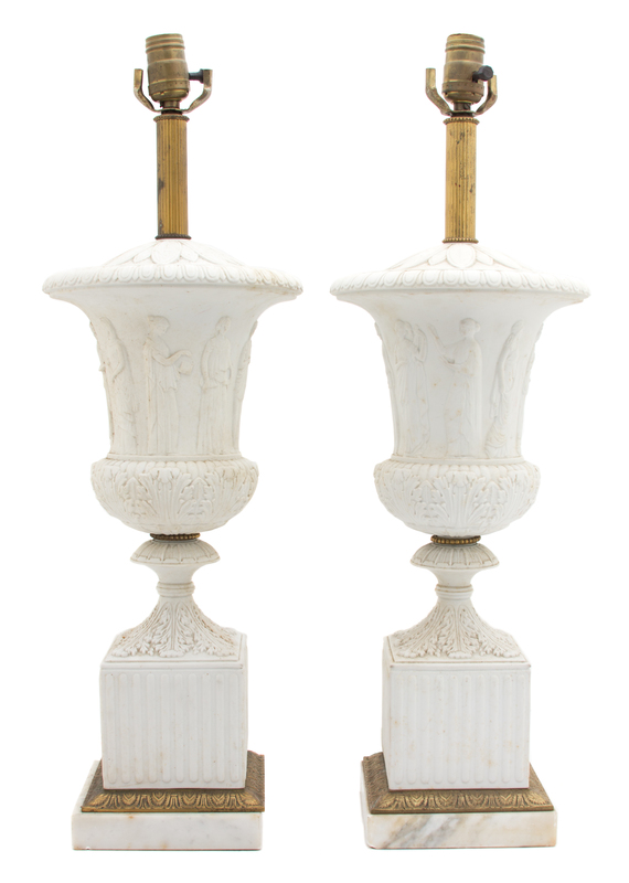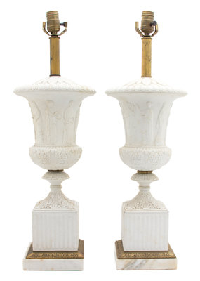 A Pair of French Empire Gilt Metal Mounted Parianware Campana Urns