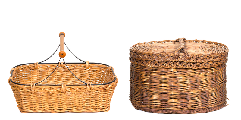one oval with lid, the other a handled basket with metal frame.