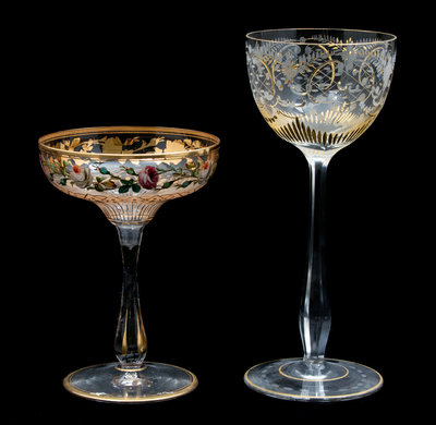 comprising five champagnes with polychromed floral banding, 11 wines with etched and gilt decoration and 4 olive stemmed etched and gilt decorated wines; 21 items total.