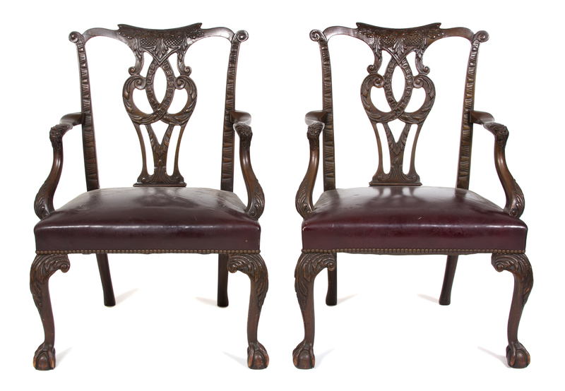 A Pair of George II Style Carved Mahogany Open Armchairs