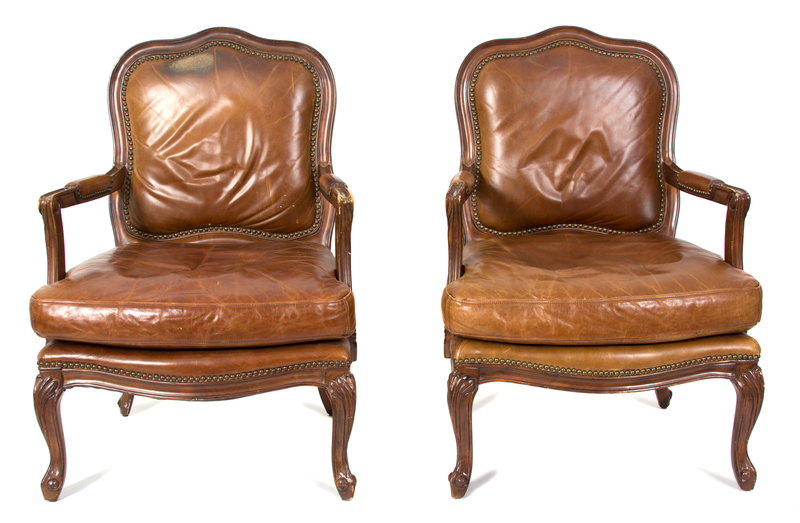 having brown leather upholstered back rest, seat and arm rests.